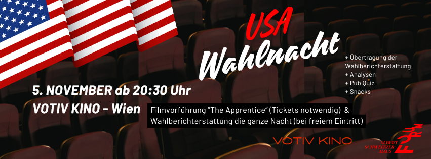 Nach der Filmvorstellung steht der große Saal im Votivkino allen USA-Fans und Politikinteressierten gratis offen. Einfach vorbeikommen, mitfiebern und die Stimmung genießen! Durch den Abend führt Journalist Tori Reichel.